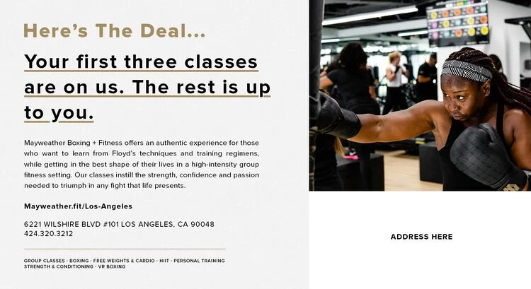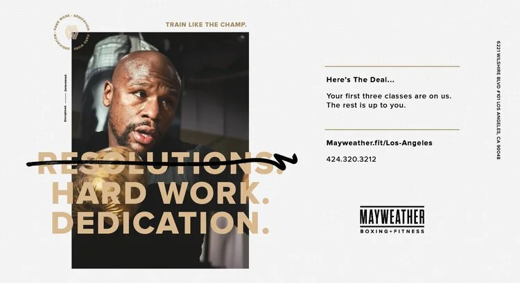 During my time at Mayweather Boxing + Fitness I worked on anything and everything you can think of that might need a visual touch. Print and digital marketing, internal playbooks, manuals and documents, interior and exterior graphics for walls and windows, social media content, photography, and video.